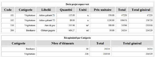 Exemple de résultat d'un calcul de métrés