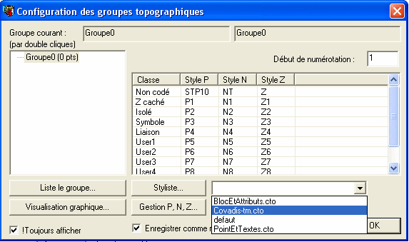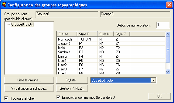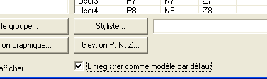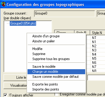 • Attention : ces modifications réalisées dans la fenêtre de configuration des points topograhiques ne sont pas conservées une fois AutoCAD fermé. Si vous tenez à conserver vos modifications, vous devez demander à sauvegarder le paramétrage comme un modèle. Il existe deux manières : par un clic droit dans les noms de groupes ou en cochant la case « Enregistrer comme... ». Dans le premier cas, un menu contextuel permet de gérer les modèles (ouvrir, enregistrer), dans le second cas, la mémorisation se fait dans le modèle par défaut.