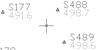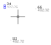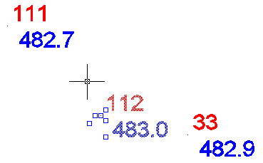 • Maintenant lisons le fichier point (ici le 9210.Go7 du dossier exemple), et effectuons un zoom sur des points. Le piqué et les textes sont des entités indépendantes bien que RD12 les marque de façon invisible. Ce mode est très souple d'emploi mais dans les zones denses, il est parfois difficile de savoir où est le piqué correspondant à un texte sans appeler les fonctions de l'applicatif.
