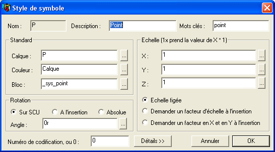 • Pour en savoir davantage sur les styles utilisés, il suffit de cliquer dessus avec le bouton droit. Par exemple, un clic droit de la souris sur la colonne « Style P » de la ligne « Non codé » affiche la fenêtre suivante. On voit ainsi que le piqué va être représenté par une entité point d'AutoCAD (« _sys_point ») dans le calque « P ». On peut procéder de même sur les styles « N » et « Z ».