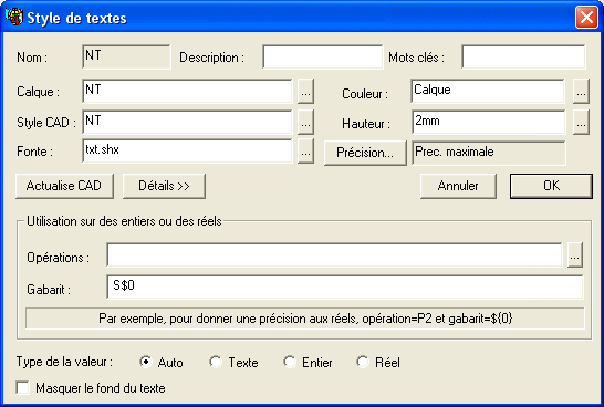 • Maintenant utilisez le clic droit pour définir le style « NT ». N'existant pas encore une pancarte vous demandera de confirmer sa création : il s'agit là d'un raccourci évitant de retourner dans le styliste. Cliquez le bouton « Détail » et dans la zone « Gabarit » saisissez «  S$0 ». Cela indique le texte à afficher, $0 ou ${0} étant remplacé par le numéro topographique. Un espace est placé en tête afin de décaler le texte par rapport au piqué. Validez le tout et chargez le fichier point.