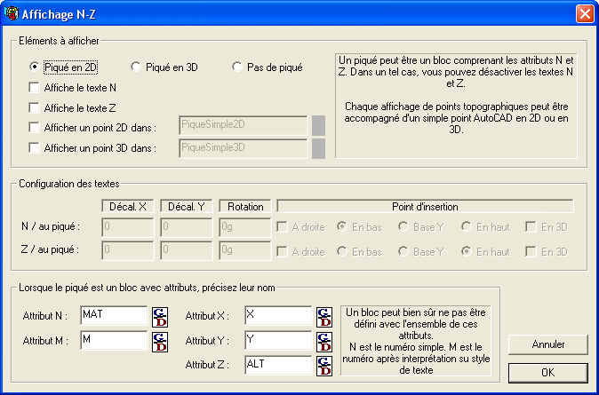 • Si vous souhaitez en savoir davantage sur le modèle courant, pressez le bouton « Gestion PNZ ». Par exemple ici on affiche juste le piqué (en 2D) : en effet le N et le Z sont sous forme d'attributs inclus dans le bloc-piqué TCPOINT. Au bas de la fenêtre on indique les attributs à utiliser.