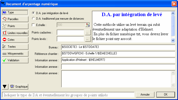 • Au lancement de la commande, on indique le type de D.A. à effectuer. Ici, un DA par intégration d'un levé. Il est possible de préciser les groupes de points contenant les points cadastres et nouveaux, mais ici tous les points sont dans un même groupe. Enfin, vous disposez d'un formulaire : son contenu sera ajouté au fichier d'échange cadastral. Il peut contenir des alias ou variables au format ${...}. En bas à gauche, une flèche noire permet d'accéder aux options et de personnaliser ce formulaire. Vous pouvez spécifier les valeurs de vos alias dans le menu « SI Système>Propriétés partagées »