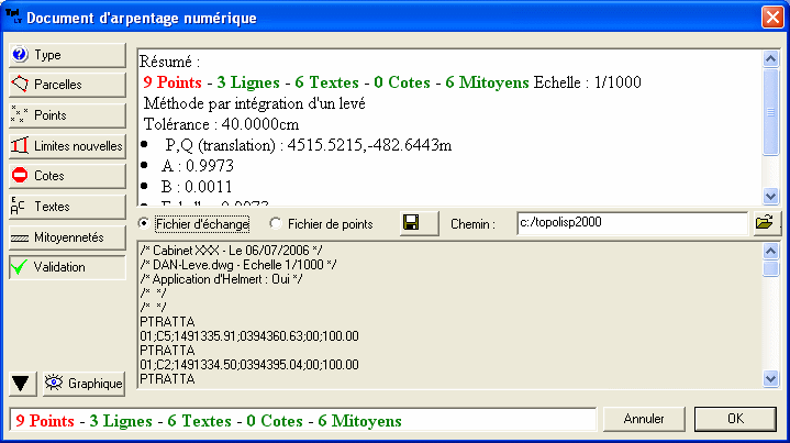 • Pour terminer, il faut aller dans « Validation » sur la gauche. Le fichier d'échange sera construit dans le dossier indiqué. Pour enregistrer le fichier d'échange et le fichier point, pressez la disquette.