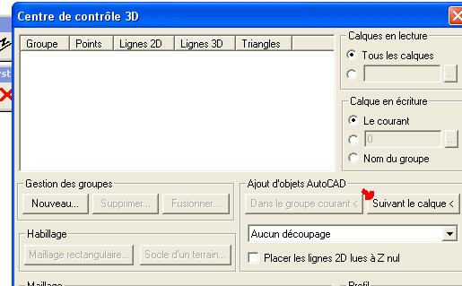 • Le centre de contrôle 3D apparaît : le dessin ne contenant que des éléments du même terrain (points 3D dans le calque 'P'), cliquez simplement sur 'Suivant calque'.