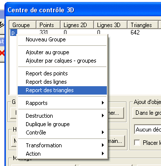 • Le centre de contrôle affiche maintenant le nombre de triangles calculés. L'affichage du maillage n'est pas nécessaire pour la suite, Mais ici on va tout de même l'afficher : faîtes un clic droit sur le groupe et cliquez 'report des triangles'.