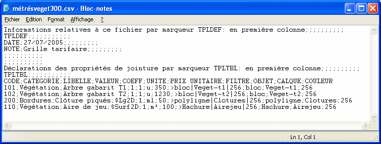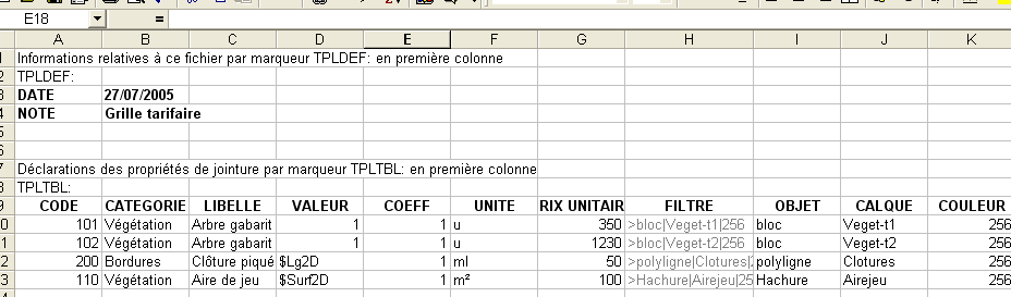 Il y a deux marqueurs particuliers qui doivent apparaître en première de colonne : « TPLDEF: » indique que les lignes qui suivent sont des propriétés (nom en colonne A, valeur en colonne B) qui pourront être utilisé par le rapport; « TPLTBL: » indique que la ligne qui suit donne les libellés de colonnes et qu'à la suite se trouvent les divers éléments de métrés.