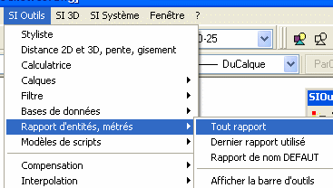 • Pour utilisez votre nouveau métrés, utilisez le menu SI Outils>Rapports d'entités, métrés>Tout rapport, puis sélectionnez le métrés à exécuter et ensuite les entités du DWG.