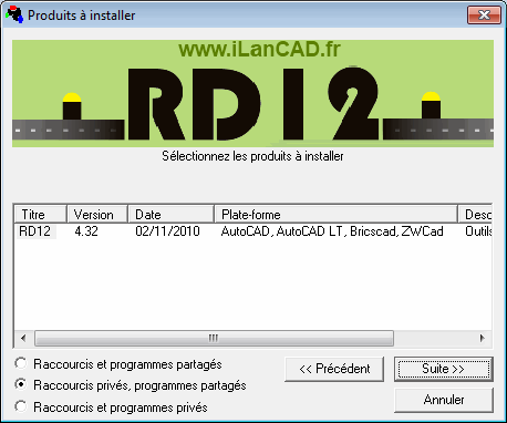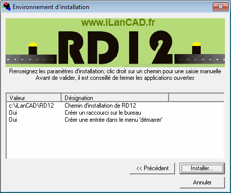 puis lancez le. Après confirmation il supprime les dossiers gérés par RD12 : c:/ilancad/rd12, Mes Documents/RD12Contexte, Menu Demarrer/iLanCAD.